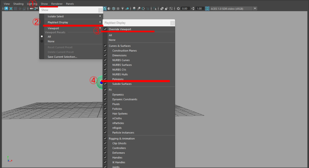 この状態でPlayblastで動画を書き出しても表示されていない場合はPlayblast Displayの「Polygons」にチェックが付いていない可能性があります。