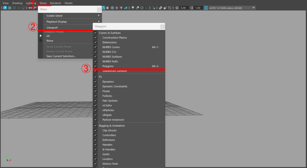 ビューポートの左上にある「Show」から「Viewport」を選び、「Polygons」にチェックが入っているか確認